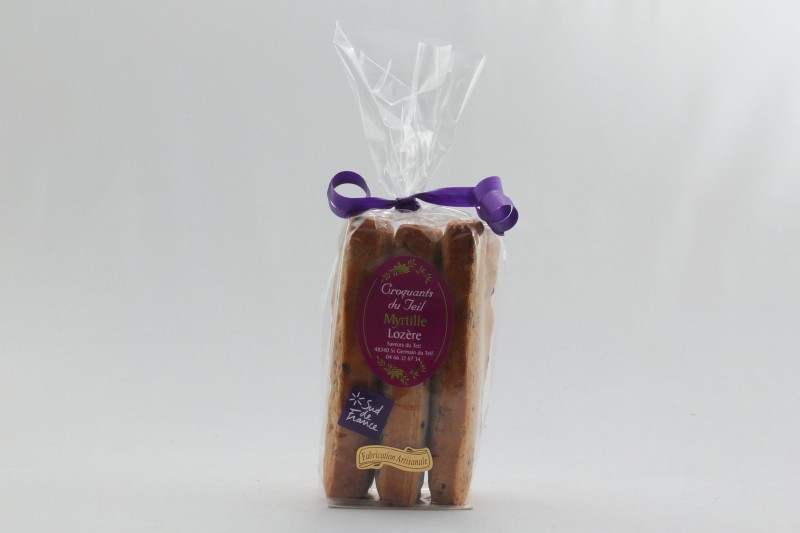 Découvrez les croquants du Teil aux myrtilles. Des biscuits fabriqués artisanalement en Lozère par la boulangerie/pâtisserie Saveurs du Teil.